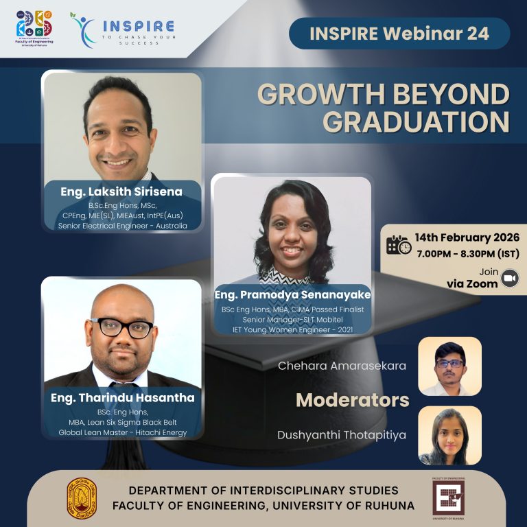 Join us for an insightful and engaging session featuring accomplished professionals Eng. Laksith Sirisena, Eng. Pramodya Senanayake, and Eng. Tharindu Hasantha, as they share real-world experiences, practical guidance, and strategies for navigating career growth beyond university life. This webinar is organized by the INSPIRE Initiative of the Faculty of Engineering, University of Ruhuna, with the…