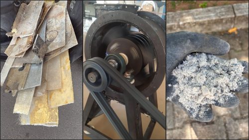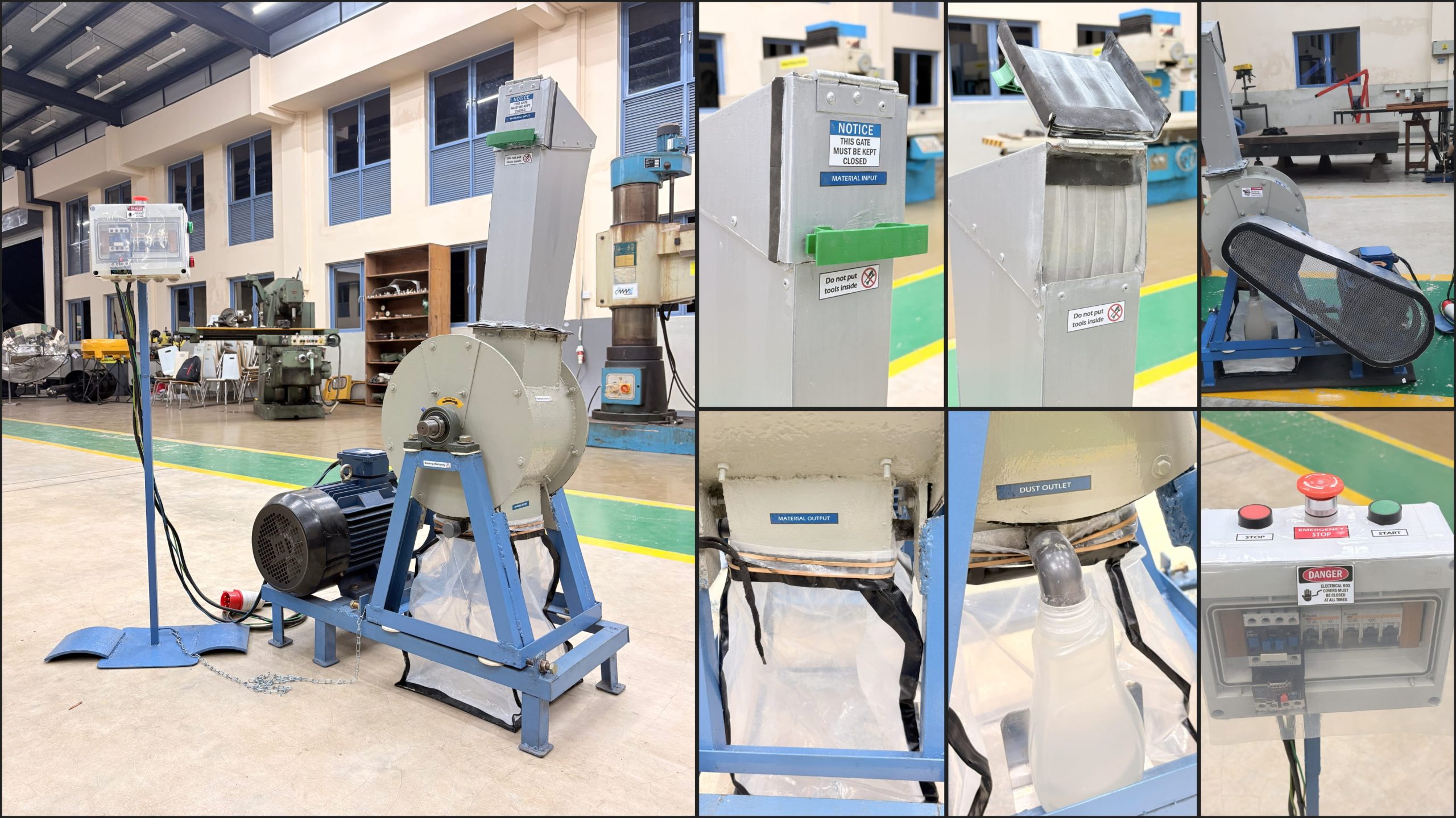 A fully sealed crushing chamber minimizes dust emission during operation. Minor dust release during feeding is controlled by closing the inlet gate before crushing. Since crushed particles and dust fall within similar size ranges, no separation system is used. Excess air is safely vented and directed into a water-based collection system, where dust is captured and mixed with water for potential reuse, such as in concrete-related applications. Overall, the machine offers a cost-effective and locally suitable solution designed for fiberglass boat-waste recycling in Sri Lanka.